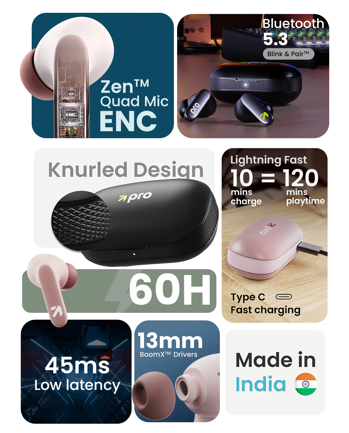 Wireless Earbuds with AI Powered ENC, 45ms Ultra-Low Latency, Supreme Bass, 60 Hours Playtime and IPX5 Rating